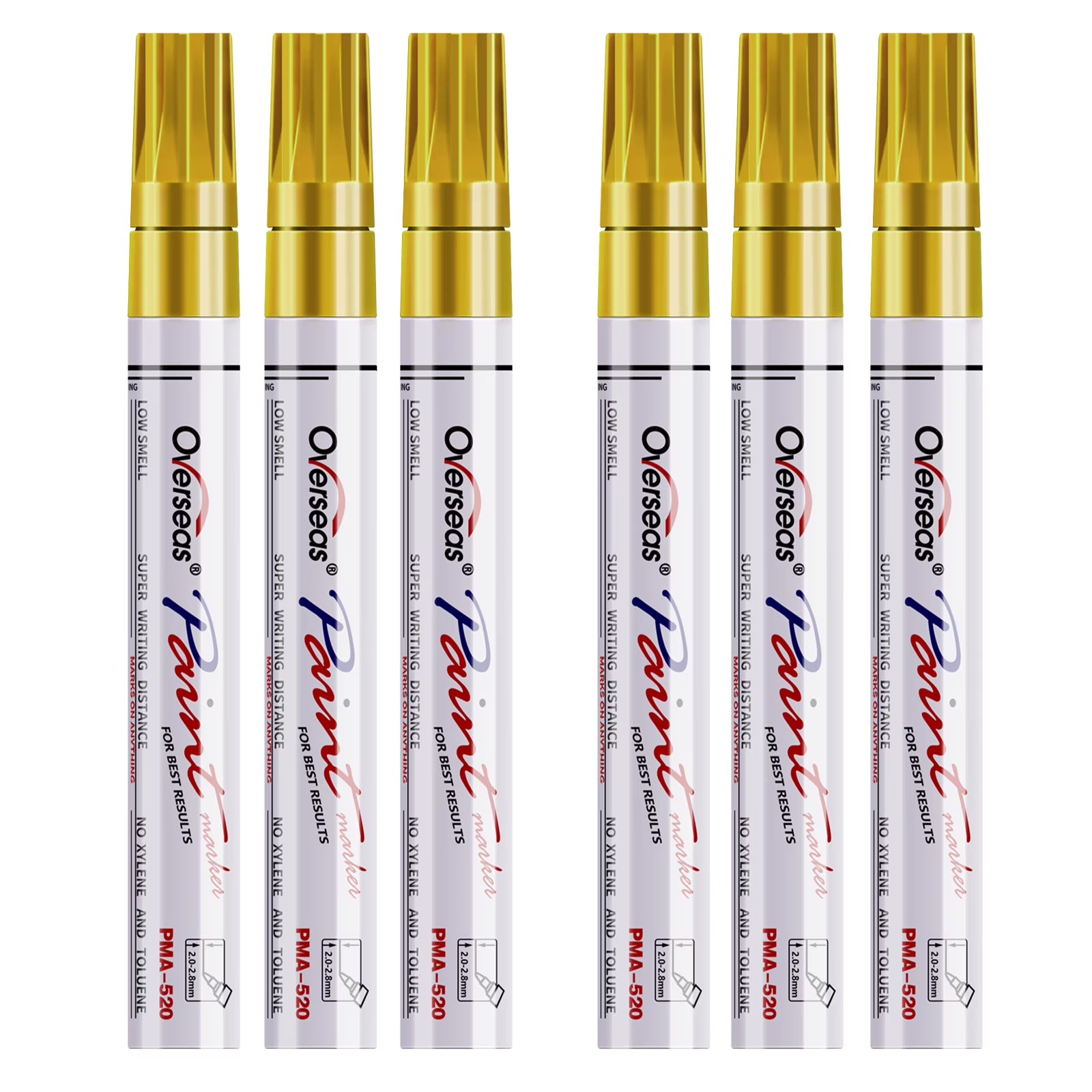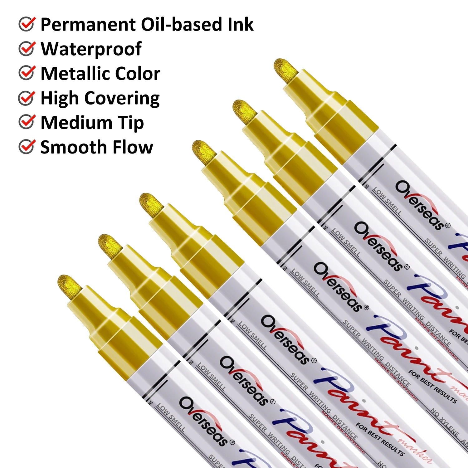 Overseas Gold Paint Markers Pens - Single color 6 Pack Permanent Oil Based Metallic Paint Pen, Medium Tip, Quick Dry and Waterproof Marker for Rock, Wood, Fabric, Plastic, Canvas, Glass, Mugs, Canvas, Glass
